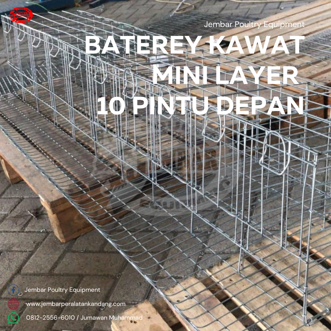 Baterey Kawat Mini Layer 10 Pintu ㅡ Dirancang khusus untuk peternak, Baterey Kawat Mini Layer 10 Pintu ini mengutamakan kekuatan rangka, ketahanan terhadap korosi, serta kemudahan panen telur dan perawatan ayam. Menggunakan bahan hot dip galvanized iron wire bersertifikat SNI, kandang ini memiliki daya tahan tinggi terhadap kelembapan dan amonia kandang.