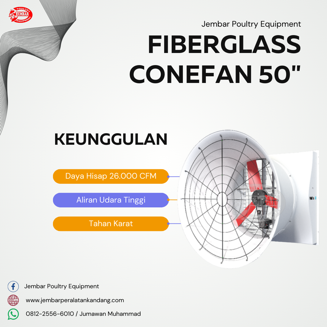 Fiberglass Conefan 50 inch dari Jembar Poultry Equipment adalah exhaust fan berkekuatan tinggi untuk kandang dan industri. Tersedia dalam dua ukuran dan berbagai pilihan motor (Nosch, Siemens, WEG, Louyite). Tahan lama, hemat daya, dan efisien untuk ventilasi profesional.